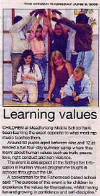 63 children returned to their primary school in Milton Keynes over the half-term holiday for four days at the end of May to take part in an SSEHV Values Alive Event. Daily activities included an hour's SSEHV class, followed by arts and crafts, cookery, music, drama sports, circle time and other fun lessons and pass-times. Each activity related to the theme of the day. Over the four days, the themes were : Life