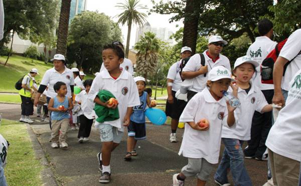 The Sai Youth Group played an active role with face painting for the children taking part, distributing balloons and handing out apples at the end of the walk. The City Council gave permission for the walk to take place, the daily paper ran an article two days prior to the walk and walkers were provided with a police escort, which controlled traffic at the intersections along the way and generally saw that everything went smoothly.