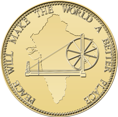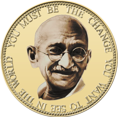 On the front side of the coin is the image of Gandhi and his famous quote "YOU MUST BE THE CHANGE YOU WANT TO SEE IN THE WORLD"