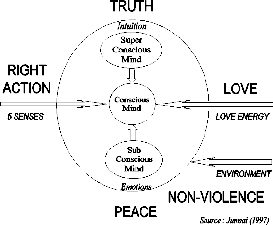 anxiety and also any positive files. The super-conscious mind is the source of wisdom, knowledge and intuition. Jumsai explains that in a balanced person, these three levels of mind contribute to the physical, mental, emotional and spiritual well-being. For this to occur, it is necessary to free the mind from extraneous 'chatter' and also to ensure that the information that is stored is 'clean', positive and constructive. This is important as its retrieval will have a significant effect on the individual's thoughts and actions. Of course, it is not possible to remove the negative files from the sub-conscious, but building on the positive experiences helps to reduce the negative effects of past experiences. Love is the most important quality with which a human being is endowed from birth. Love is interrelated to all other values. When love is combined with discernment from our 'conscience', or 'the inner self', it is Truth. The Absolute Truth is changeless throughout space and time. Basically, this Truth resides within ourselves and we call it by different names - conscience, 'inner self'. It is also referred to as the creative spark or intelligence within ourselves. When the actions are based on the dictates of the 'inner self', they become Right Action or Right Conduct. The term Right Conduct is used, as there is no other equivalent term in the English language to describe the Sanskrit word Dharma to which it relates. Dharma refers to righteousness or moral action derived not from some external forces, but through an individual's own perception of what is 'right'. The five senses (smell, taste, sight, touch and sound) receive the information from the external world, but for the resultant action to be Right Action, interaction with the 'inner self' and love is necessary. 'Right Conduct' can be explained in relation to a number of related values. Examples of these are: courage, dependability, determination, helpfulness, politeness, perseverance, resourcefulness, etc. When Right Action and Truth are practised, Peace follows. Peace is related to the recognition and management of feelings and emotions that are stored in the sub-conscious mind through past experiences. If, as a result of information from outside, the conscious mind retrieves some negative files from the sub-conscious mind, the resultant action may not be right action and in itself may add another negative file in the memory. On the other hand, if the conscious mind (Head) refers the possible action to the 'inner self' (Heart), the resultant action will be the right action (Hands). Thus SSEHV is also 3HV - Head, Heart and Hands. A person full of inner peace and love, following his/her conscience, will not act with violence: emotionally, verbally or physically. Thus, Non-violence is the final culmination of all other values. Non-violence relates to Non-violation. Non-violence is present when people do not violate self or others. It includes concern for all living beings in the form of Universal Compassion.